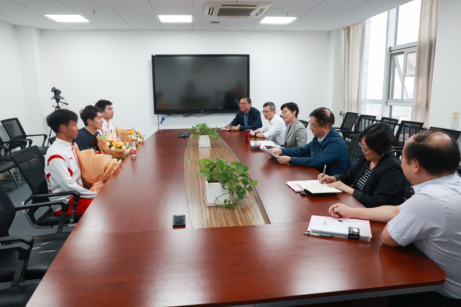 王焰新向冠军学子表示祝贺,希望他们多与老师同学交流,同时加强学习,严格要求自己,为今后的人生道路打下坚实的基础,走得更远更稳。他表示,学校是坚强后盾,会在学业、训练等方面给予全方位支持,让大家心无旁骛地在赛场上奋力拼搏,继续为国家争光,为学校争光。