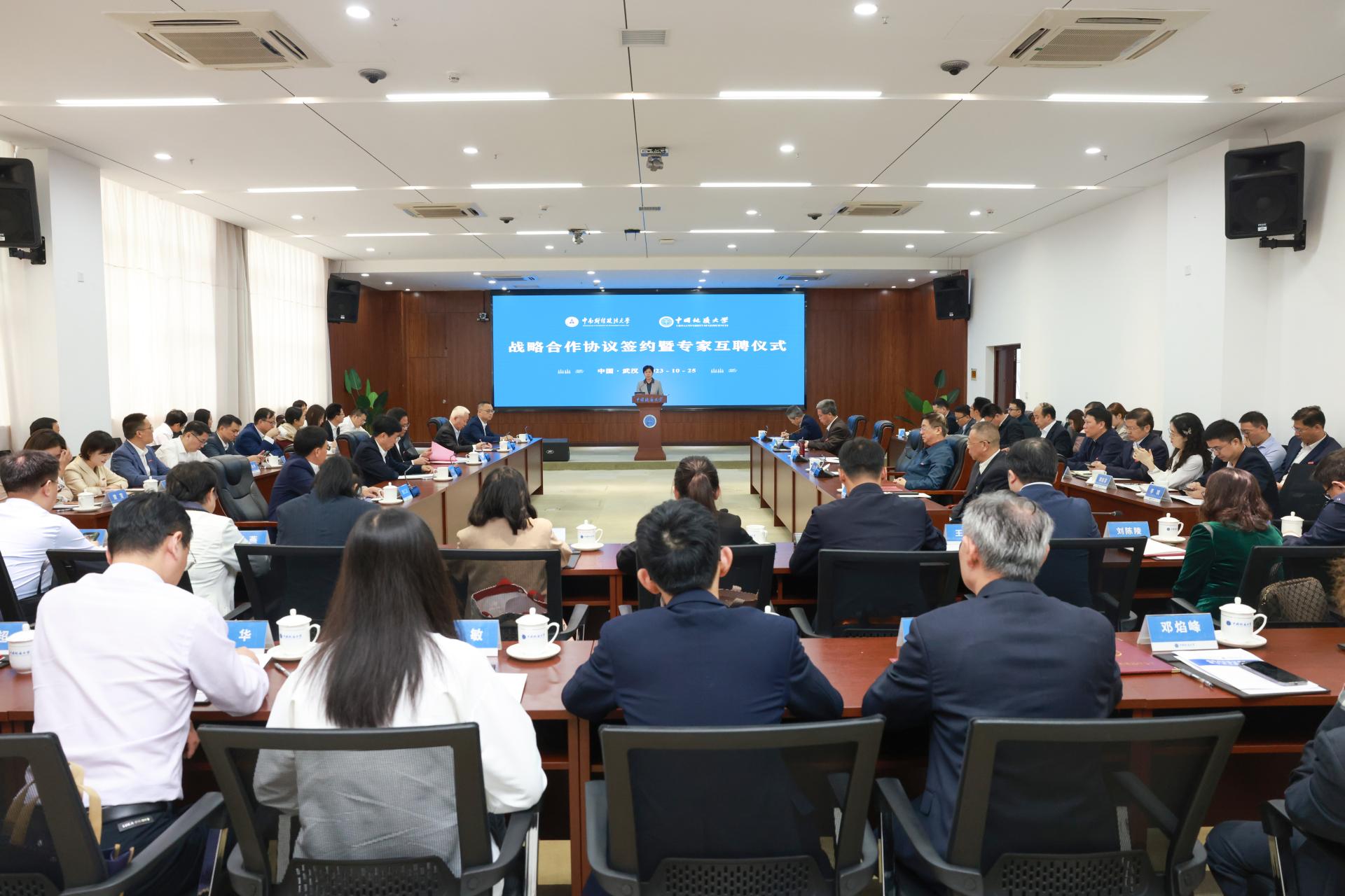 侯振发在讲话中表示,地大与中南大共饮一江水,同顶一片天,有着良好的合作基础,道合志同,在建设新文科、新工科,推进教育、科技、人才“三位一体”协同发展的大背景下,两校在人才培养、科学研究、师资队伍建设等方面合作,前景广阔、意义重大,是推动优势互补、加强人才培养的创新之举,是促进文理融通、打造合作范式的创新之举,是践行“四为”方针、服务重大战略的创新之举。他强调,两校合作必将为两校谋发展、铸一流注入强劲动力,必将为国内高校开展校际合作打造新范式,必将为加快教育强国建设、支撑服务中国式现代化贡献更大力量,期待两校以此次签约和专家互聘为新起点,围绕“双一流”建设和高质量发展,通力合作、强强联合,携手为强国建设、民族复兴贡献更大力量。