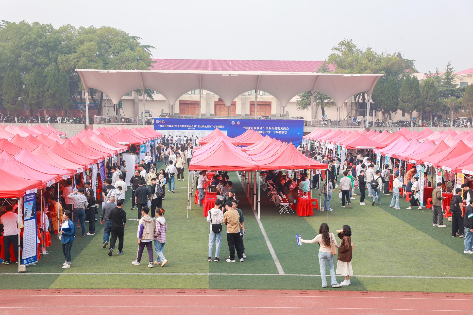 地大新闻网讯 (通讯员 刘志兴 戚清林 摄影 王俊芳 孙雨洪 张镇阳)10月29日,“湖北百校联动”毕业生供需见面会暨“宏志助航计划”专场招聘会在欧博南望山校区西区运动场举行。