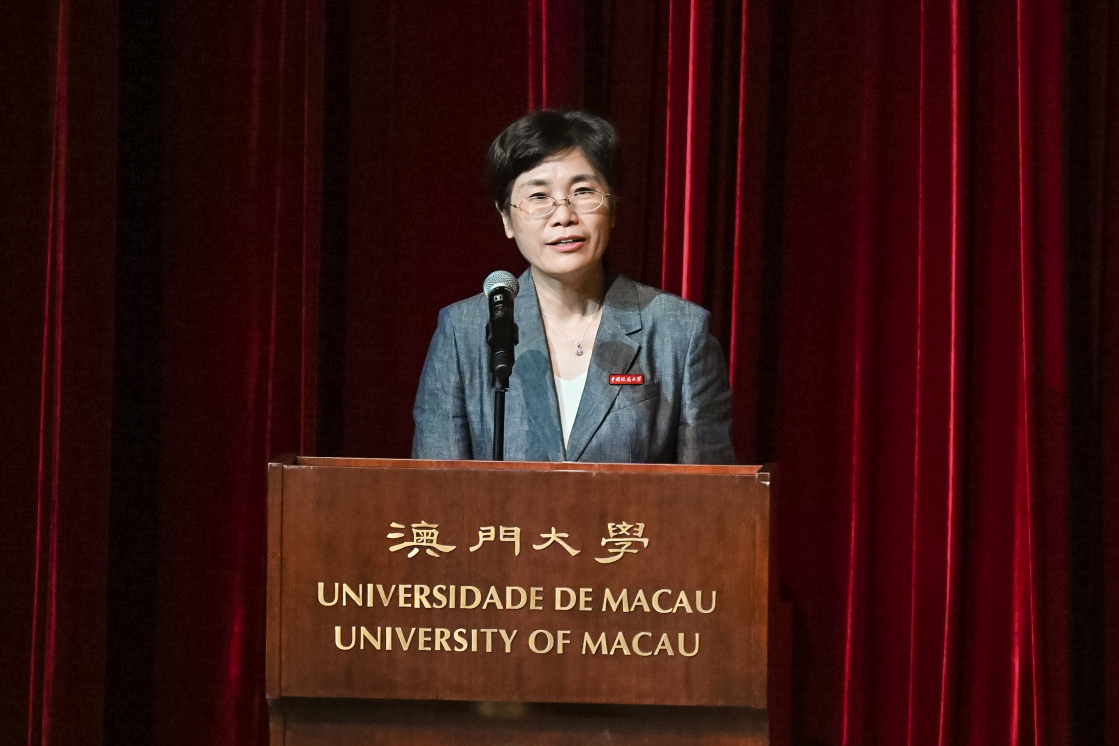黄晓玫介绍了话剧《大地之光》以及李四光先生与地大的渊源,她强调,一代代地大人不忘初心使命,把红旗扛在肩上,继承和发扬“爱国奉献、追求真理、淡泊名利、勇于担当”的李四光精神,把论文写在祖国大地,谱写了地质报国的华章。希望借《大地之光》首次走出内地在澳门大学公演的契机,促进两校科技工作者和青年学生更加相近相亲,携起手来,为强国建设、民族复兴做出新的更大贡献。