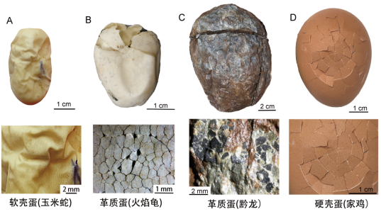 为了研究恐龙及其他爬行动物在繁殖方式上的宏演化规律,研究人员在前人的基础上收集了爬行动物210个类群,并对所有类群的蛋壳类型和蛋壳厚度等指标进行了统计,建立迄今最大的爬行动物数据库。在此基础上进行了祖先状态恢复分析,结果表明最早的恐龙蛋为革质蛋,外壳柔软似皮革,柔韧不易碎,不同于先前的软壳蛋(无或极薄钙质层)和硬壳蛋的起源。鳄类、恐龙和翼龙在演化的过程中蛋的相对大小呈现递增的趋势。而在蛋的形态变化上,最早的恐龙为亚圆形或椭圆形,兽脚类恐龙明显有延长的趋势。另外还发现大多数爬行类在演化的过程中均有蛋壳增厚的趋势。