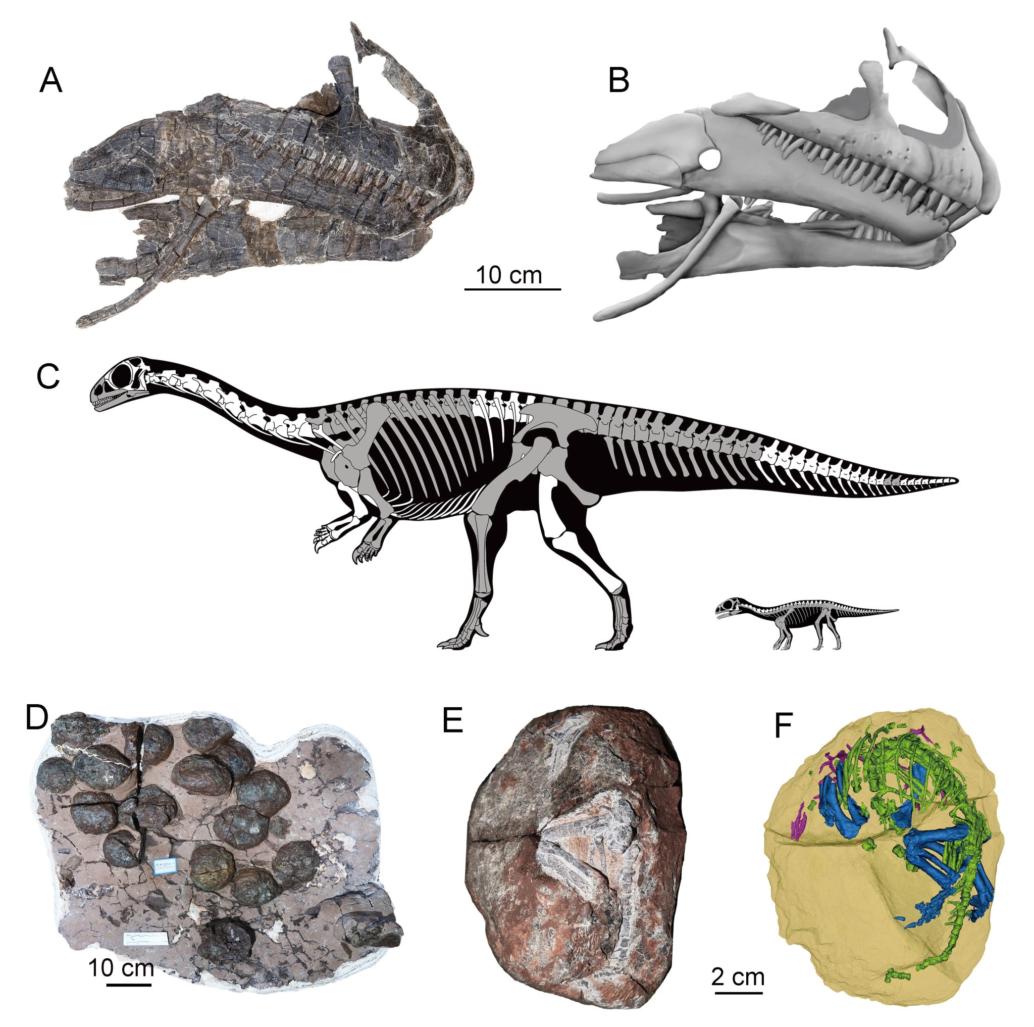 守护黔龙的头骨(A, B); 成体和幼体骨骼复原图(C); 蛋窝(D);胚胎化石及3D重建图(E, F).