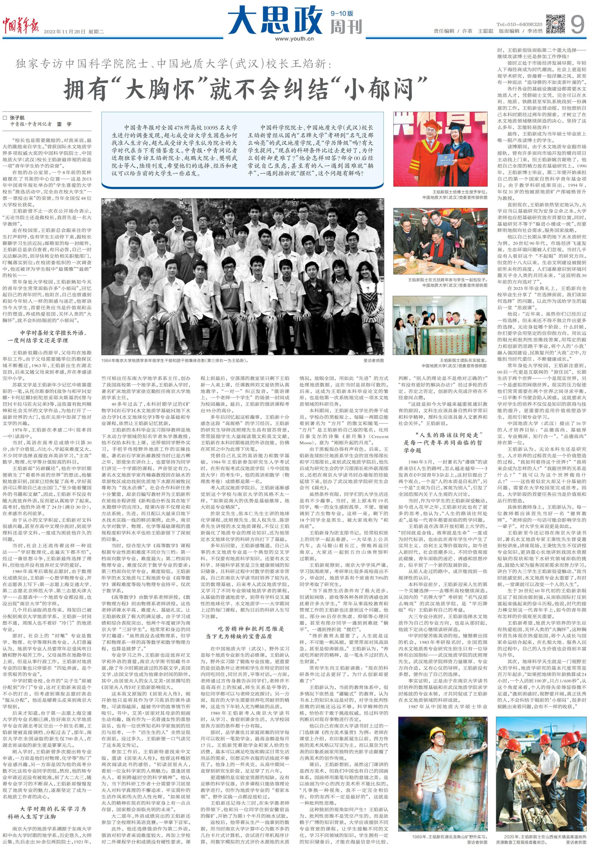 编者按:11月28日,《中国青年报》以《独家专访中国科学院院士、菲律宾欧博游戏官网(武汉)校长王焰新:拥有“大胸怀”就不会纠结“小郁闷”》为题,整版报道欧博校长王焰新院士在大学时代的选择和经历,以及给当前大学生们的建议,原文如下: