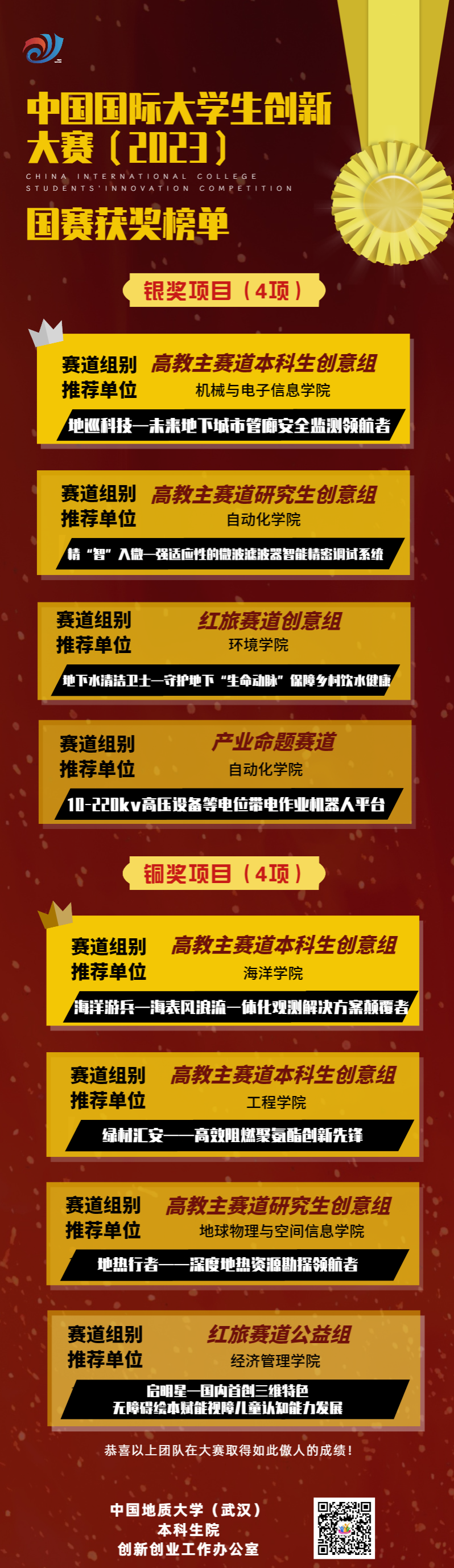 地大新闻网讯 (通讯员 陈昭颖 余司琪 摄影 靳鑫洲 王艺霖)日前,中国国际大学生创新大赛(2023)在天津大学举行。本次大赛欧博共有8个项目从421万个参赛项目中脱颖而出入围决赛,并获银奖4项、铜奖4项,实现了4支队伍进入现场赛、本科生赛道和产业命题赛道项目首次进入现场赛的突破。近三年,欧博在这项全国性赛事总决赛上累计获得1金9银13铜。