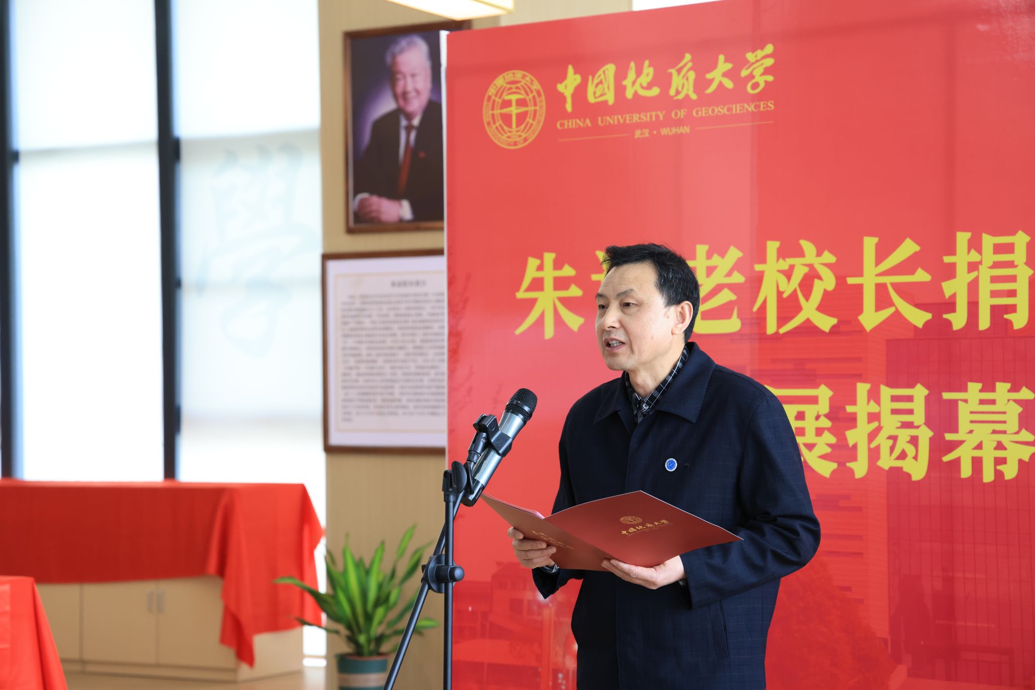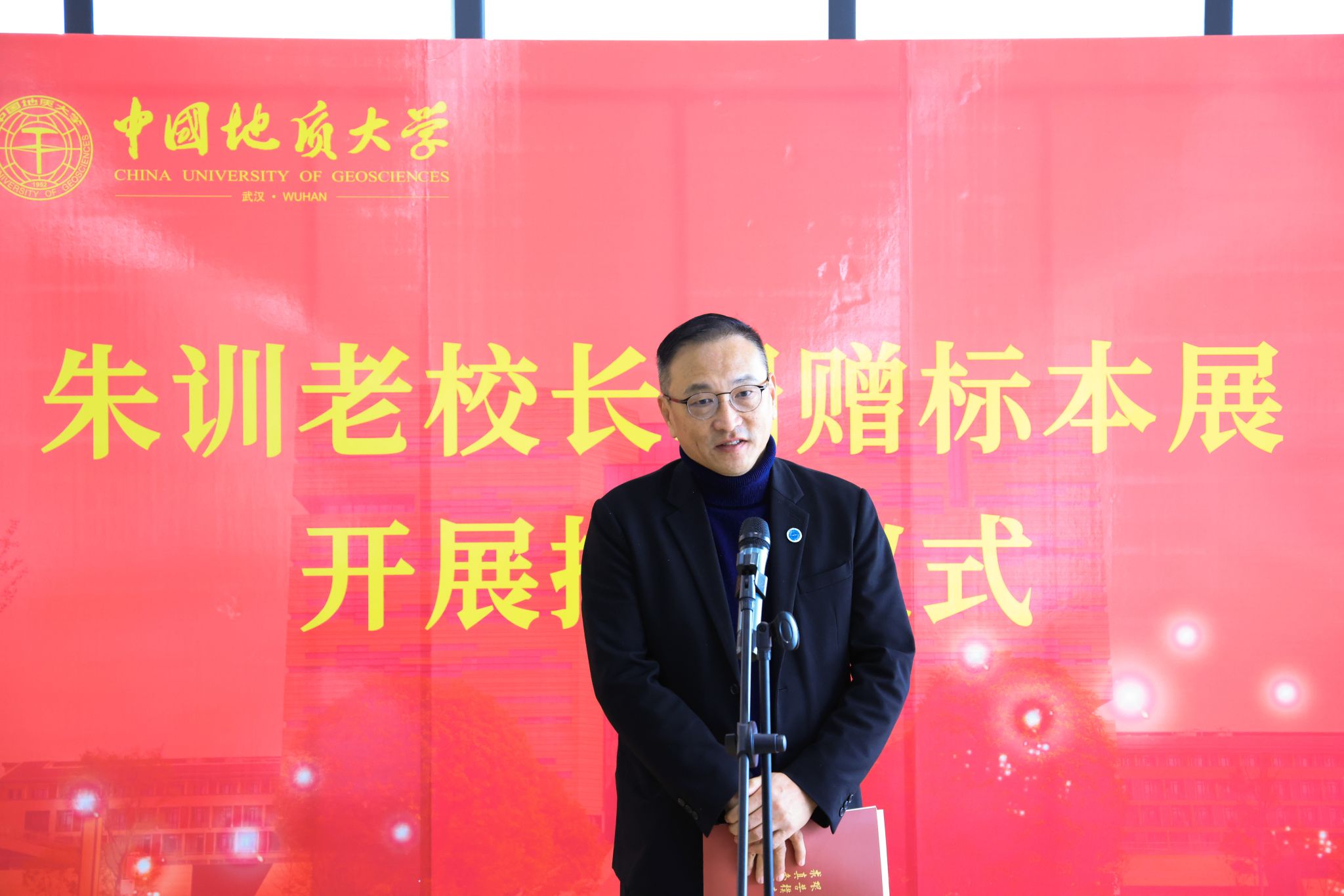 王甫在致辞中表示,学校在“朱训书屋”举行“朱训老校长捐赠标本展”开展揭幕仪式,再次见证了老校长对学校建设发展的关心和对高等教育事业的责任感。作为地质勘探战线的著名专家,老校长始终心怀国之大者,情系地矿教育事业,尤其对学校抱有深厚感情。此次标本展展出的岩矿石标本既凝聚了朱训老校长的心血,又见证了他不同时期的工作足迹,反映出老校长实事求是的科学精神和对地质工作的赤诚热爱。他指出,学校将把“朱训书屋”建设成为科普教育、文化育人和科学家精神传承的重要场所,希望全校广大师生以朱训老校长为学习榜样,发扬“艰苦朴素、求真务实”的校训精神,胸怀祖国、脚踏实地、勇攀高峰、追求卓越,为早日建成地球科学领域世界一流大学而努力奋斗。