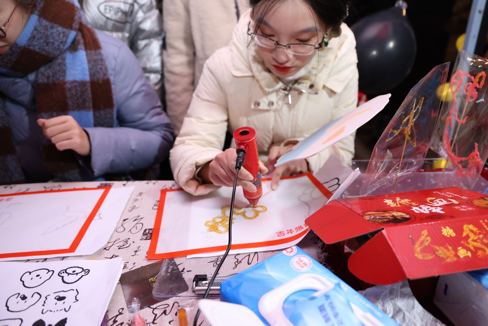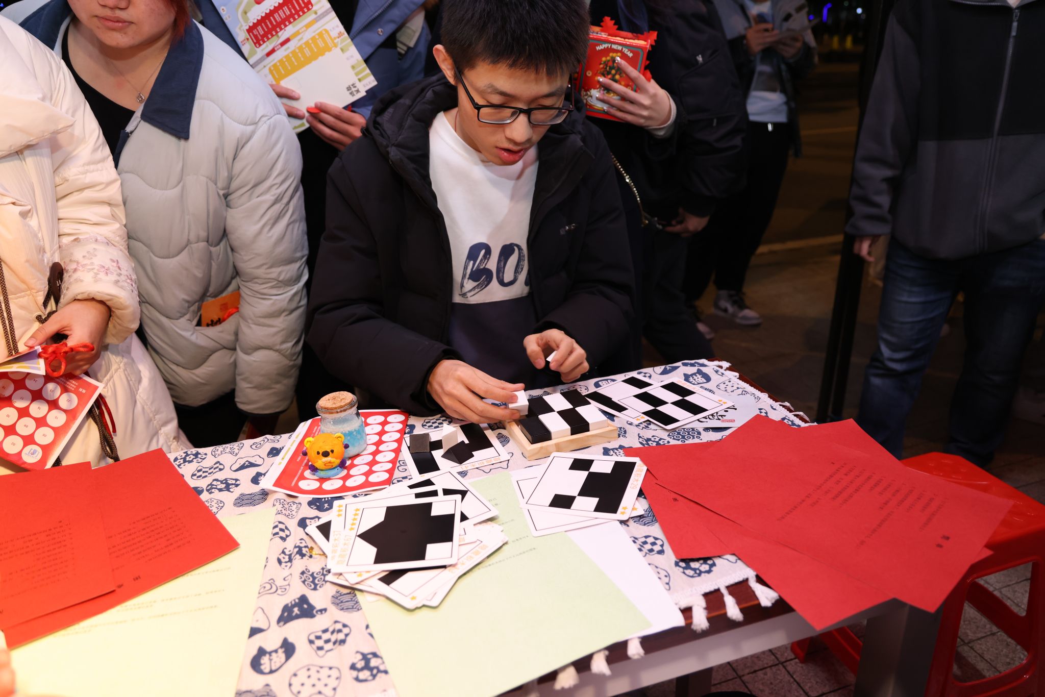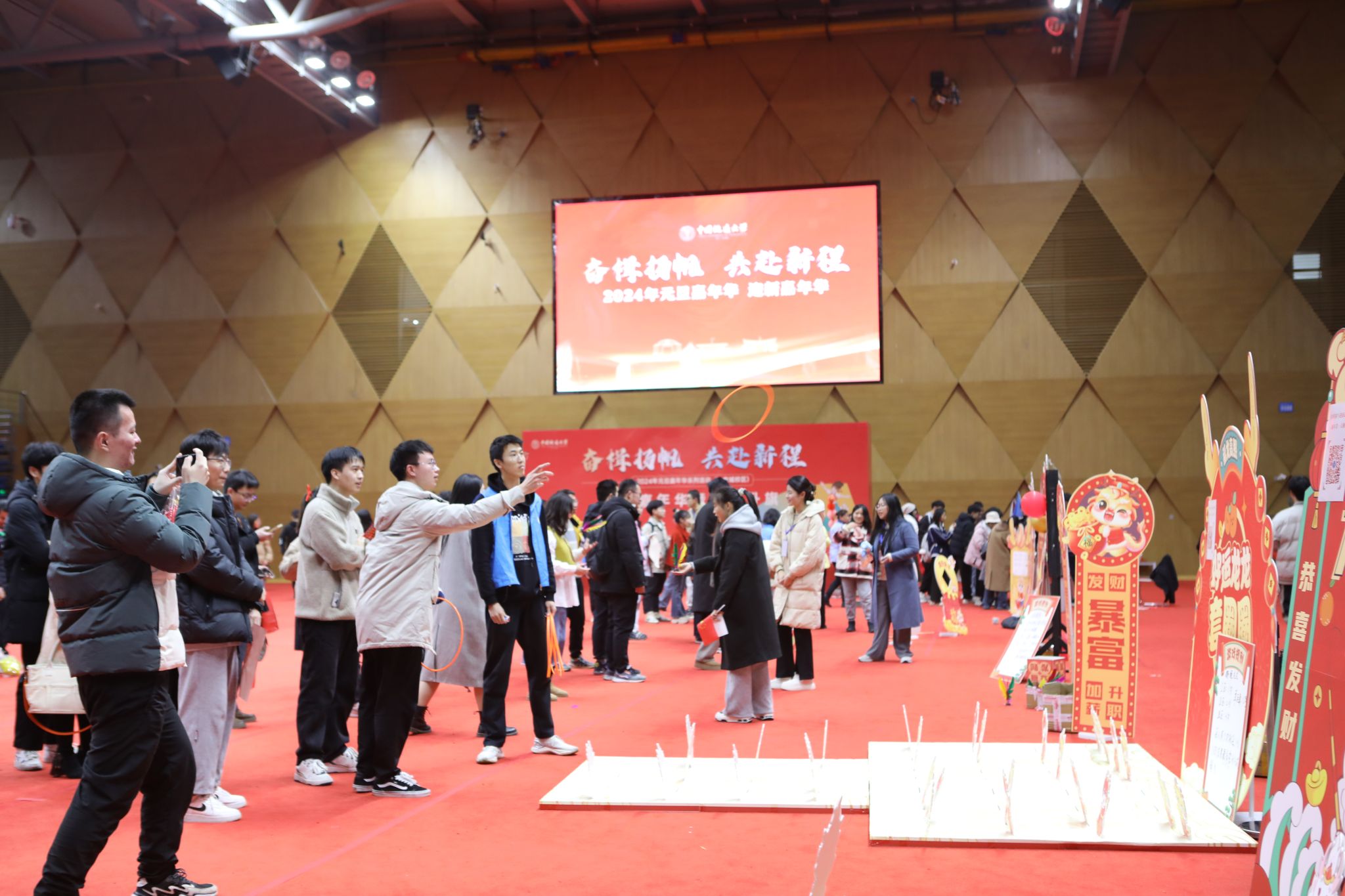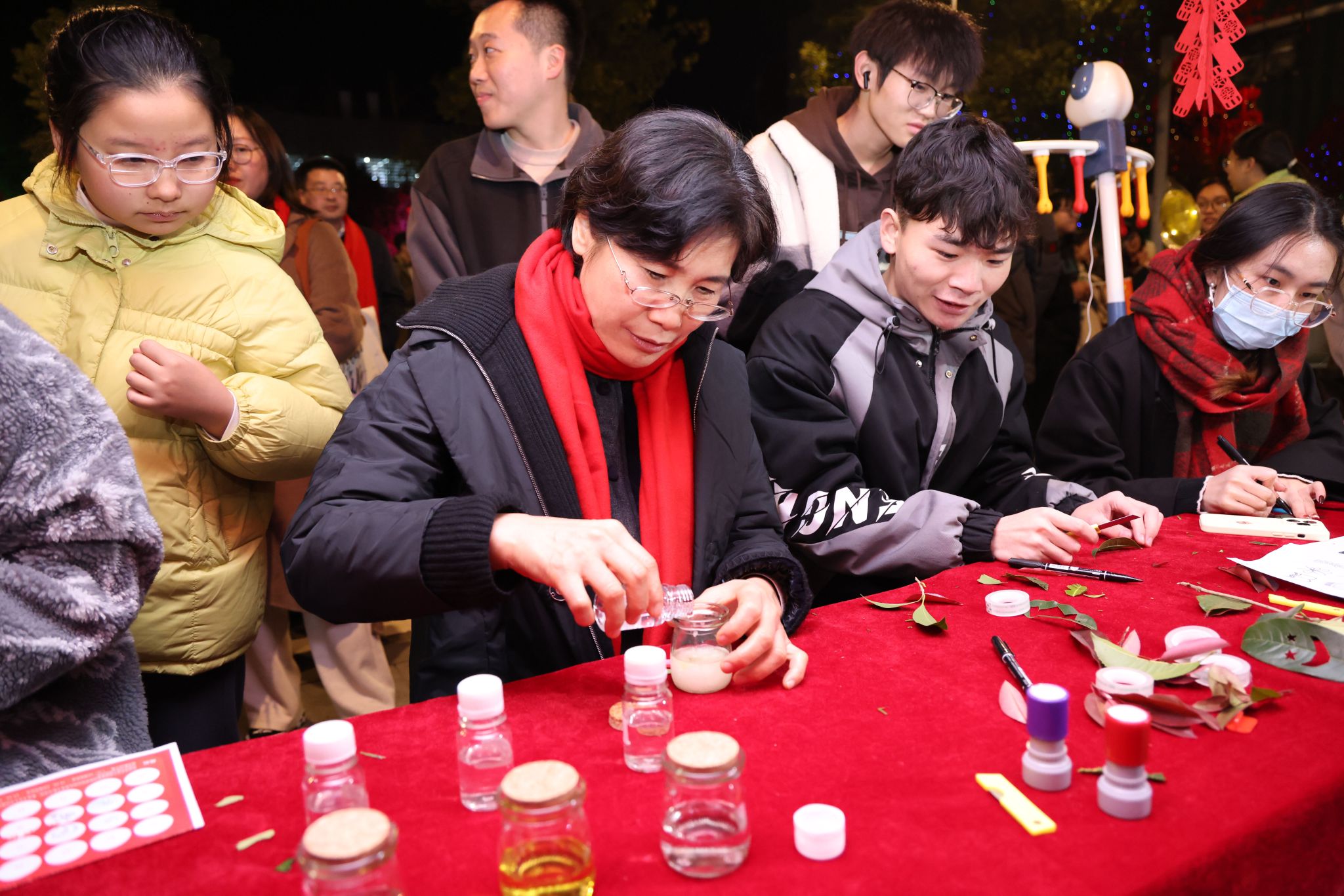 未来城校区游园嘉年华活动共有22个摊位,分为游戏区和体验区。游戏区内,各学院师生奇思妙想,将专业特色融入趣味小游戏中,如环境学院的“新年气象”环节让参与者通过DIY气象瓶预知天气情况;计算机学院设置“网络空间安全防线”小游戏,让参与者筑牢网络安全意识。体验区内设置了丰富多彩的年俗活动,如“纸花争艳”“糖画小铺”“元旦猜灯谜”“套圈”“投壶”等活动,让参与者在民俗活动中体验浓厚的新年氛围。