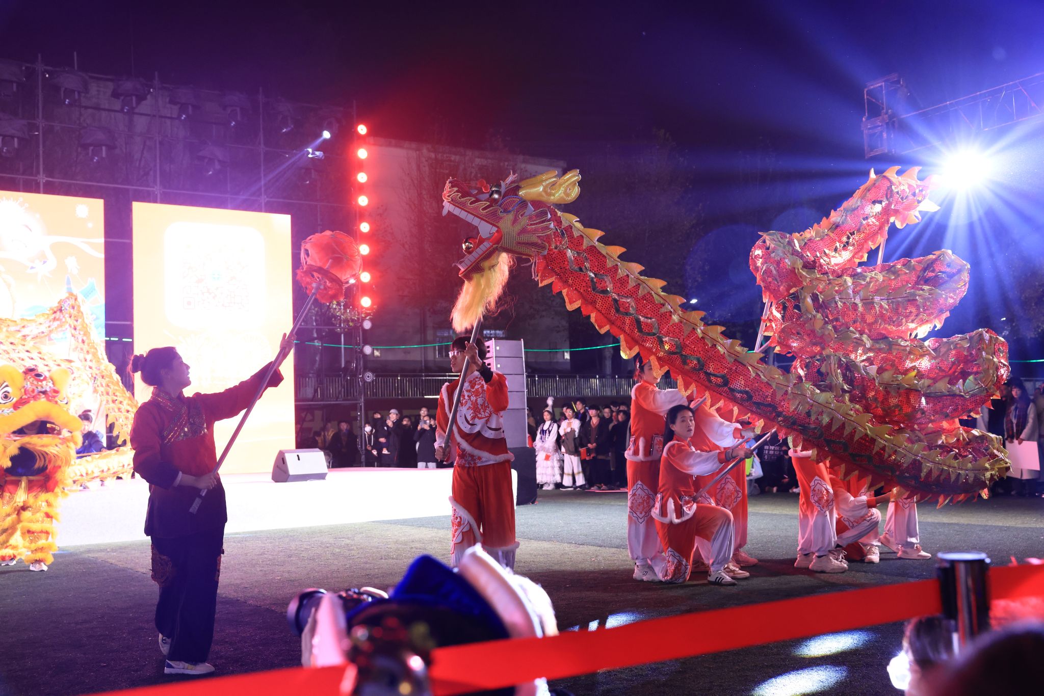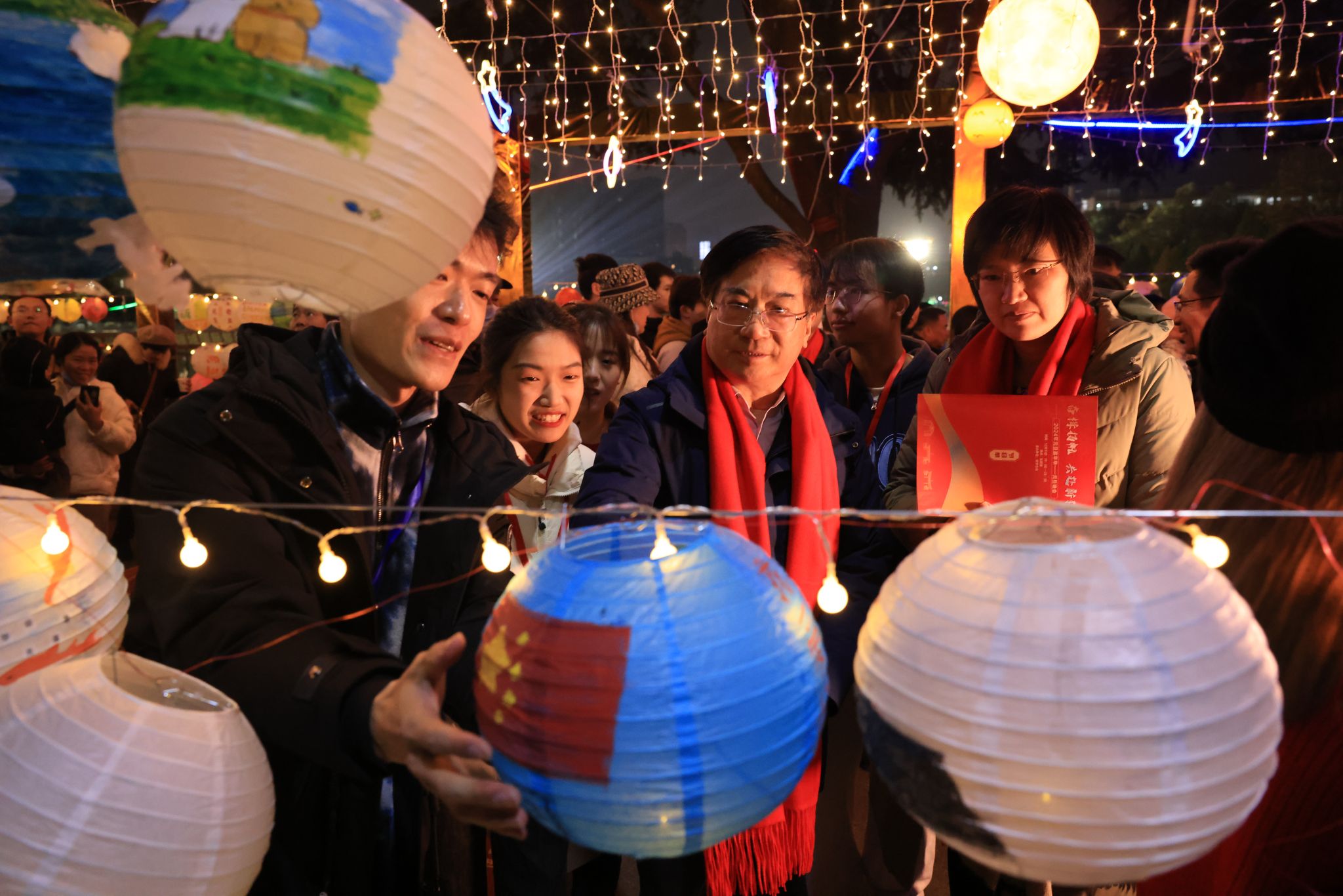在南望山校区西三路,新年灯展人潮涌动,大家纷纷驻足在这片灯光的海洋,与花灯合影留念,拍照打卡。此次灯展理念是从过去走向未来,灯街分成三个部分:古风街、跨越街和未来街,展出1000余盏花灯,均由学生志愿者绘制或来自各学院、各学生组织、花灯设计大赛的获奖作品,其中还有楚雄支教地龙江中学的同学们画的花灯,每一份创意都传递着对新年的美好期许。这一刻,橙色的灯光如同一团温暖的火焰,点亮新年梦想。