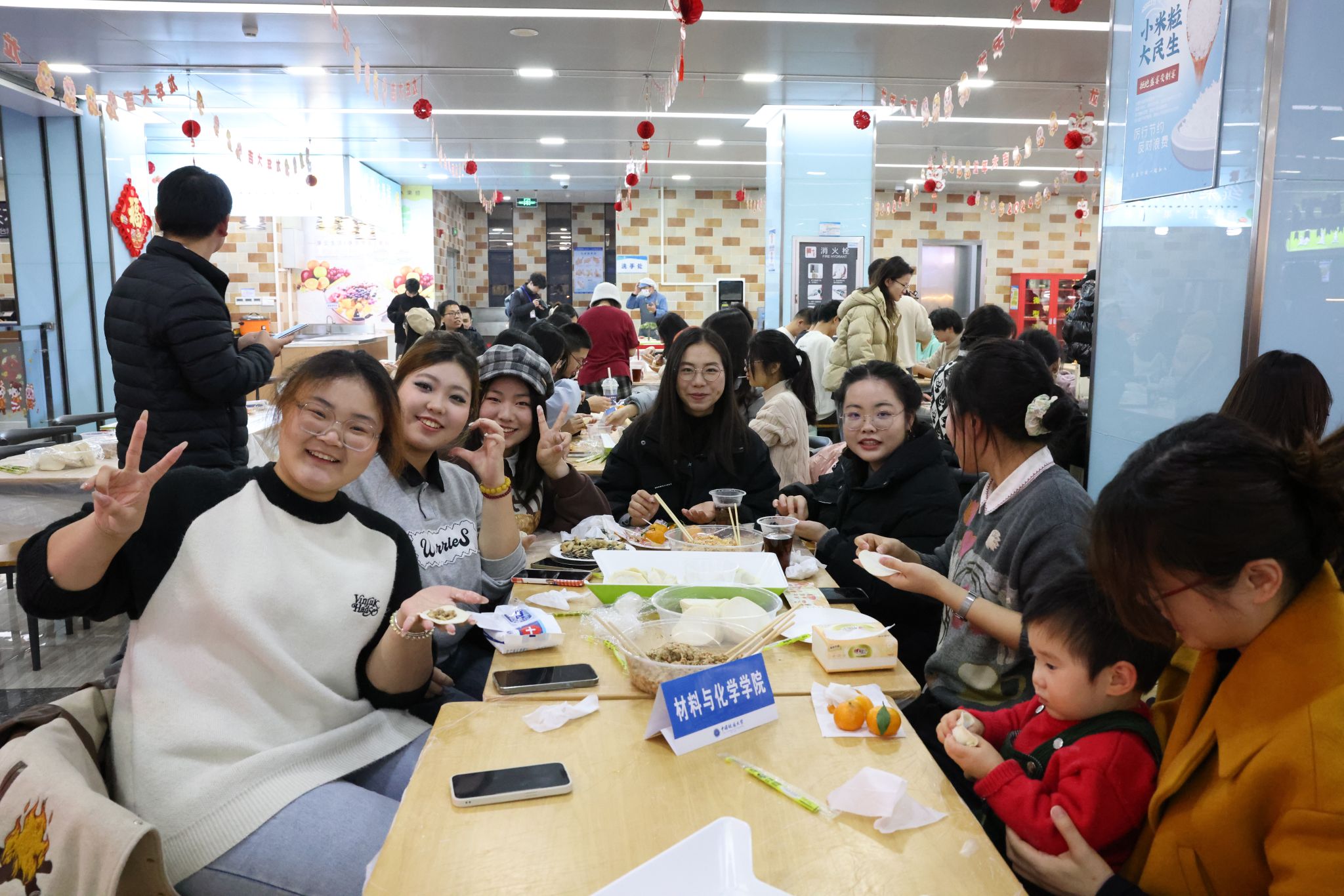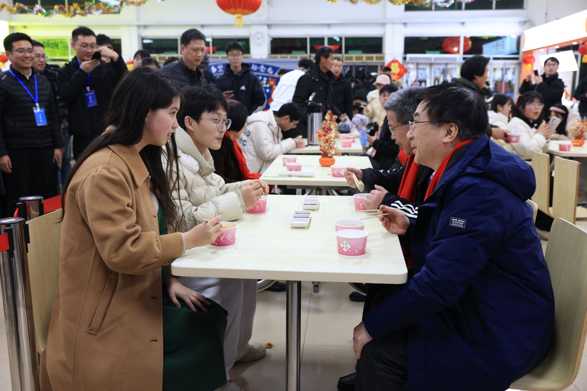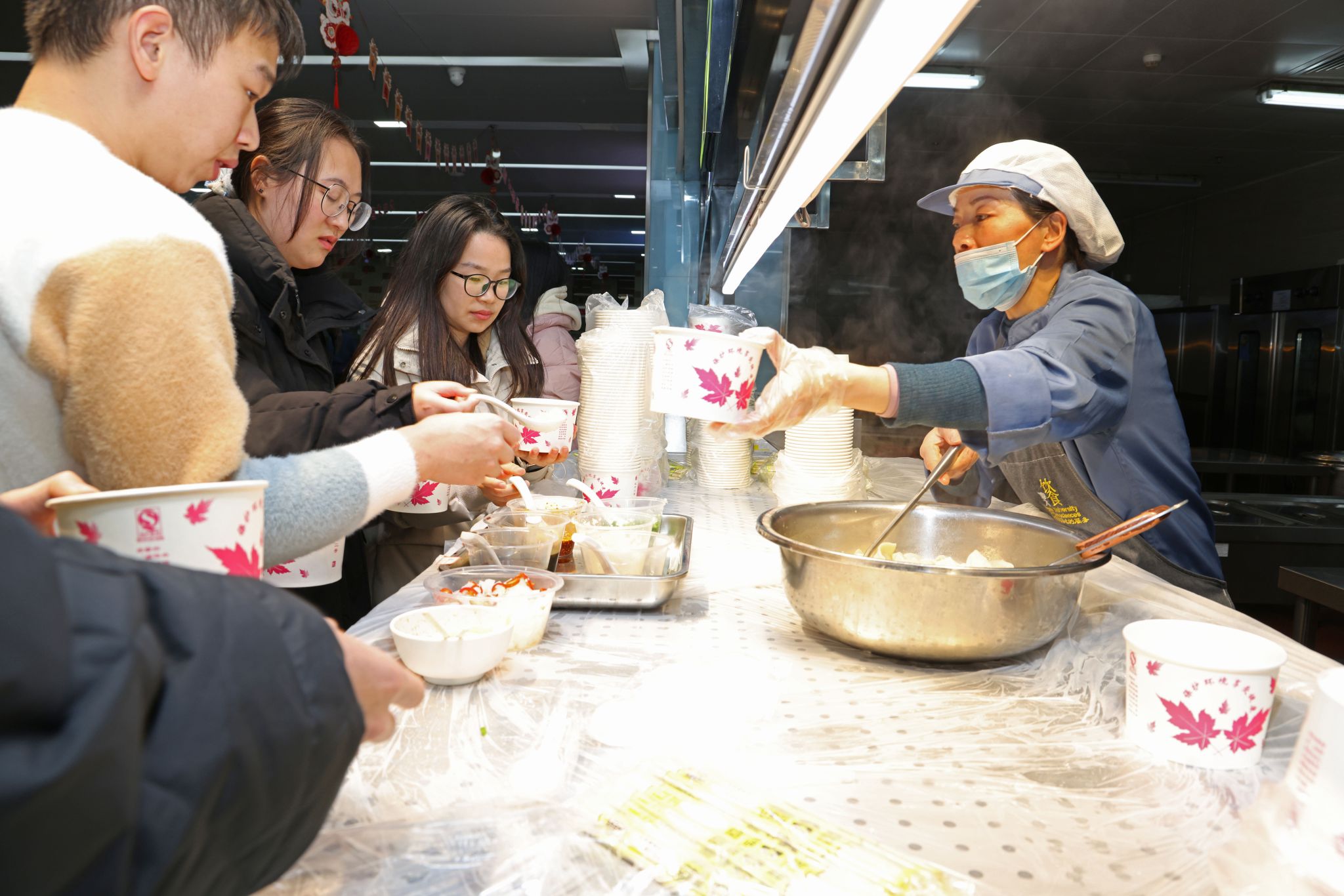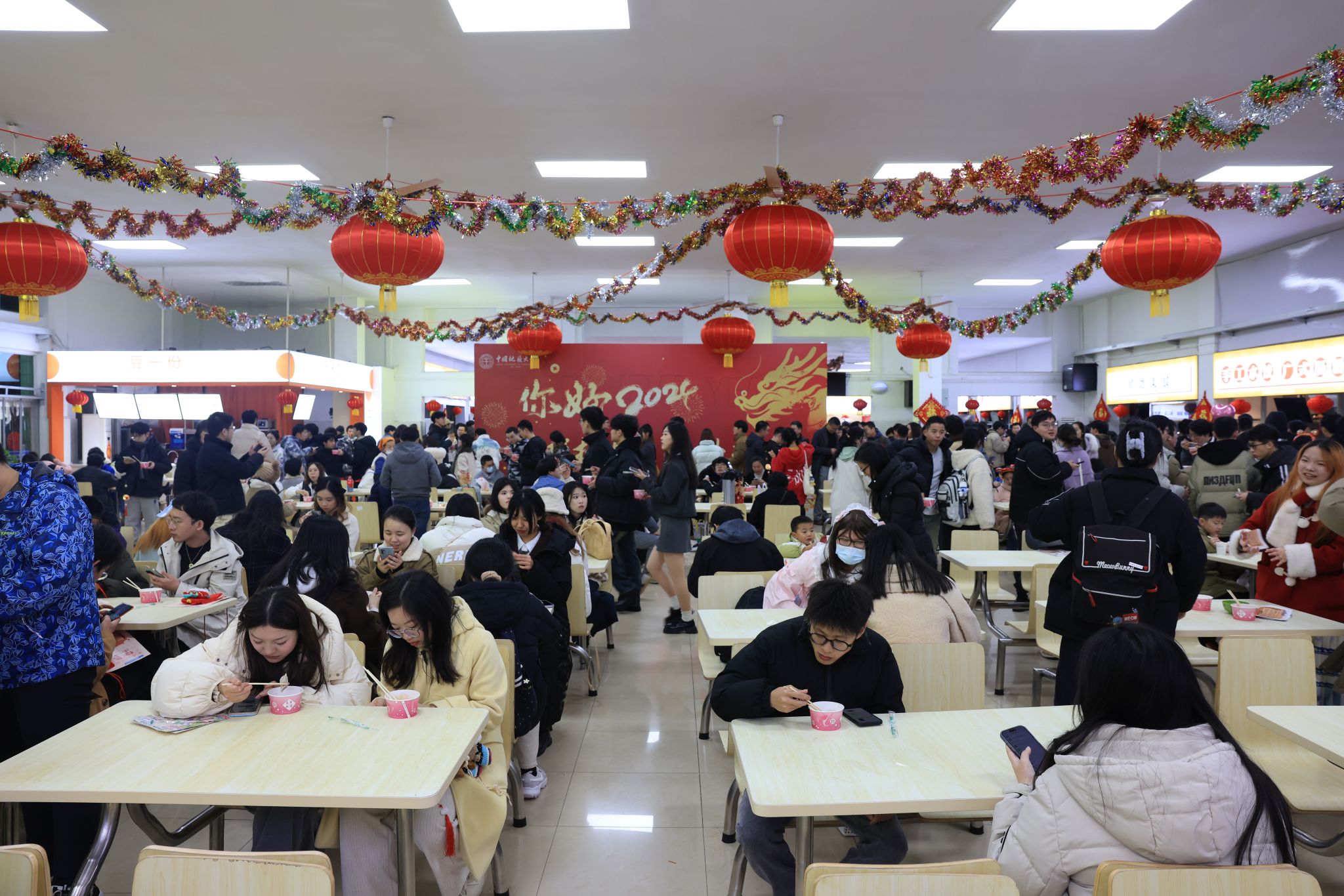 在南望山校区学三食堂,大厅里洋溢着新年的喜庆,食堂内人来人往,每个窗口都在给师生派发免费饺子。校领导与同学们共同进餐,“深夜食堂”中,一份份热乎乎的饺子,给师生们送来温暖与祝福。