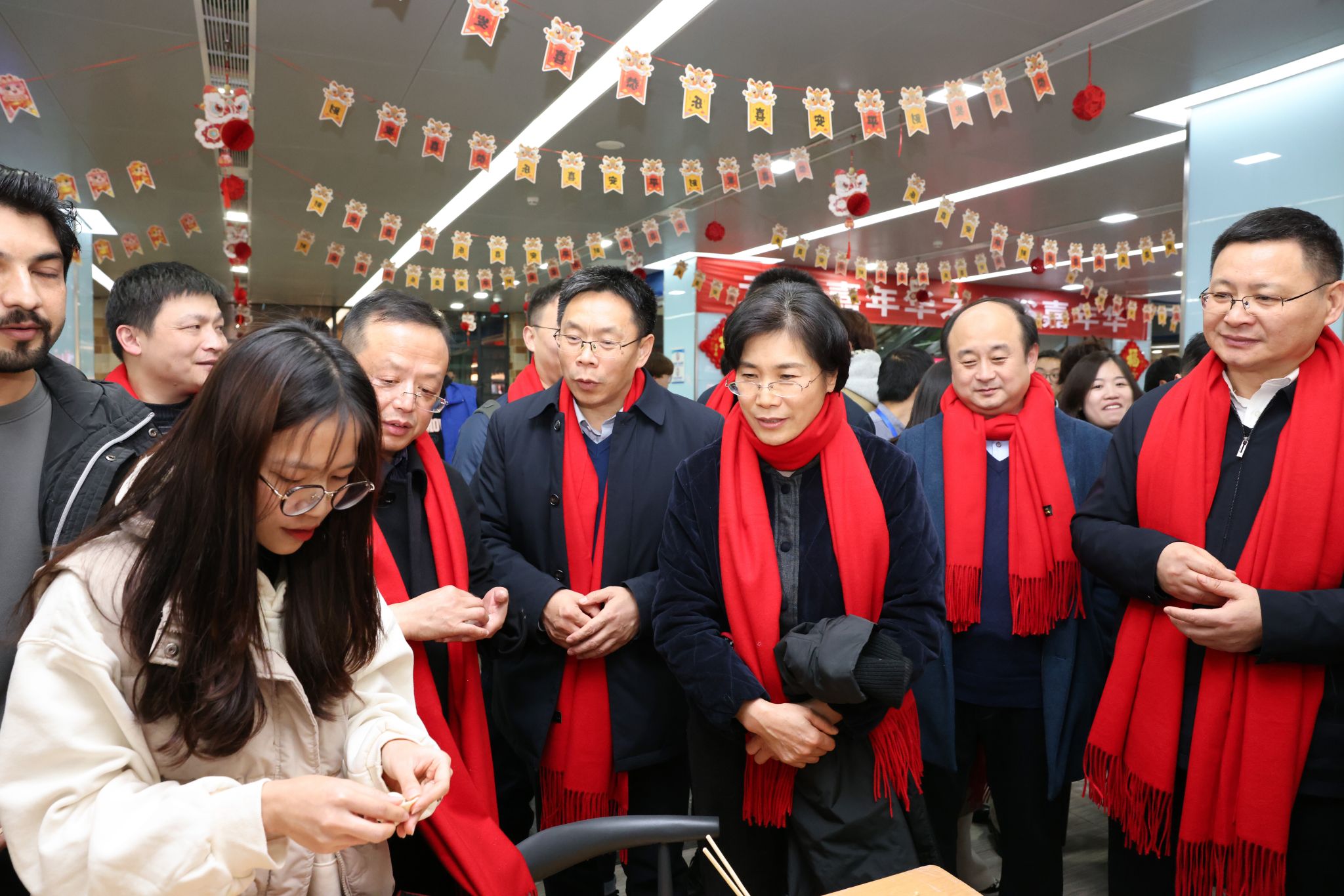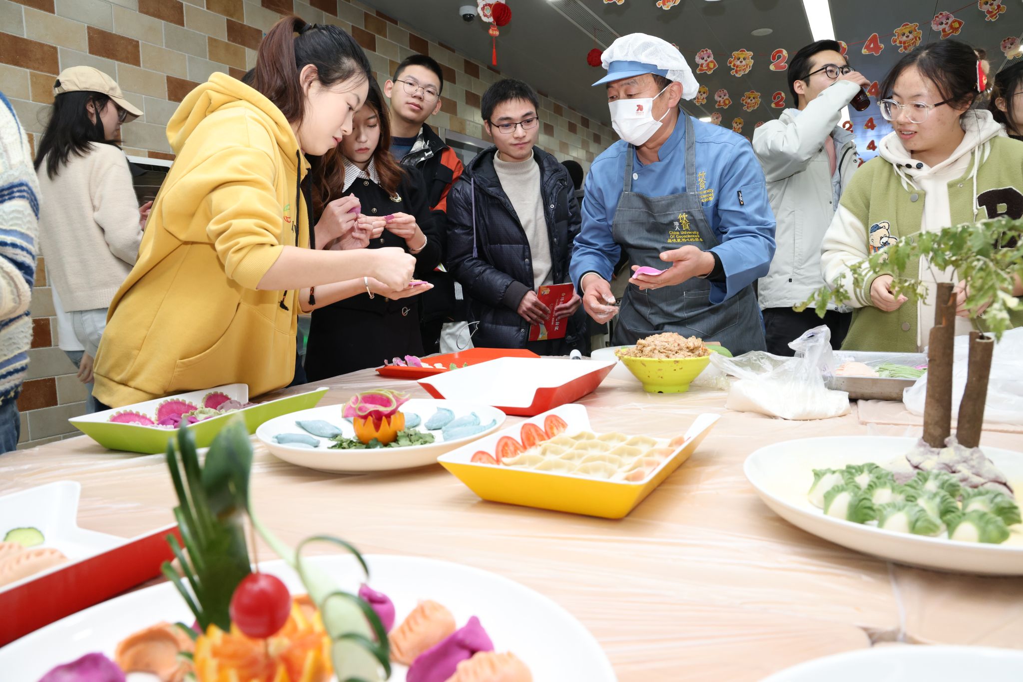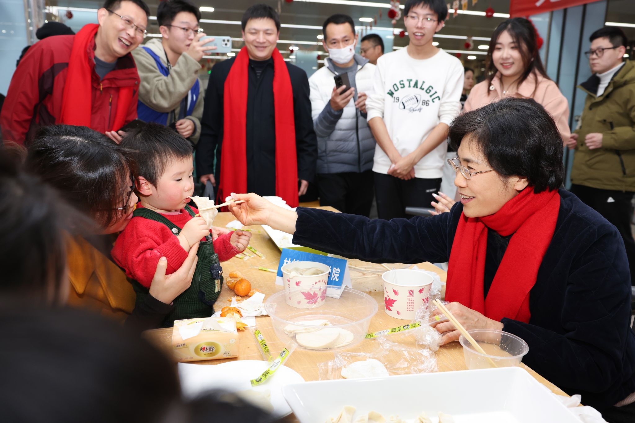 在未来城校区学一食堂,中国结、红灯笼、红福字早早地被挂起,营造出一片浓浓的节日氛围。晚上七点半,校领导和300余名师生们一起包饺子。在食堂窗口,象征幸运的“红糖饺”和师生们亲手包好的饺子一同下锅,在热气腾腾的烟火气里,感受温暖和祝福。学校还准备了特色果盘和颜色各异的饺子皮,现场进行包饺子教学,吸引不少同学围观参与。抽取2024未来锦鲤、猜灯谜、新年传话筒等活动也在同一时间进行,现场一派热闹景象。