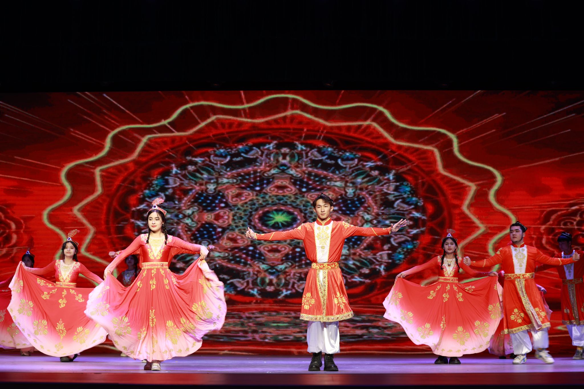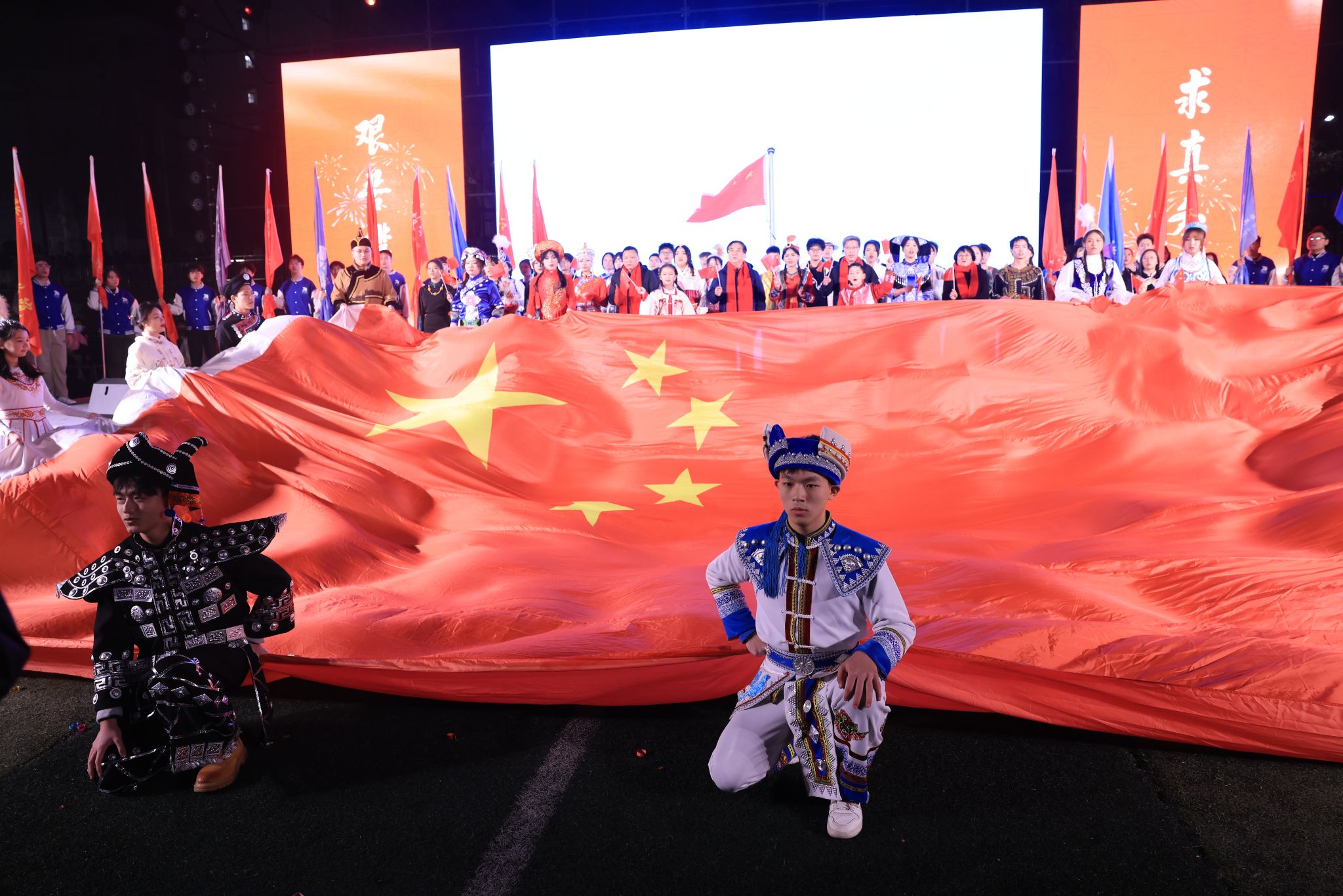 在辞旧迎新之际,两校区50余位民族学生手握红旗,身着民族服饰,与全体师生共同唱响新年第一声《歌唱祖国》,歌声让人心潮澎湃,充满了大家对祖国的自豪和期望。