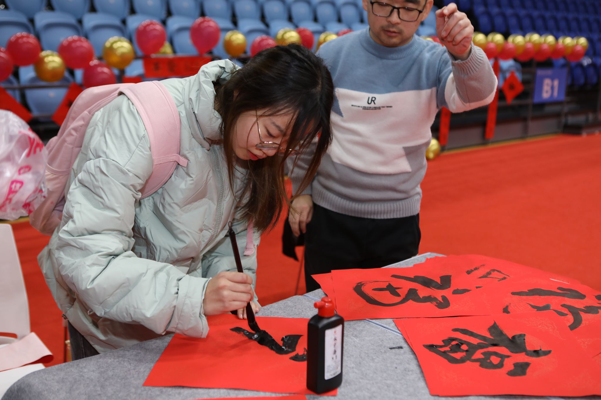 未来城校区体育馆的迎新嘉年华热闹非凡:投壶、钓鱼、套圈、踢毽子、丢沙包……多重游戏带来多重喜悦;东北大花袄、奶龙玩偶、定制可乐,最特别的礼物撞上最惊喜的相逢;书法送“福”写下新年新景的期盼。同学们灿烂的笑脸,爽朗的笑声,使得嘉年华其乐融融,分外惬意。