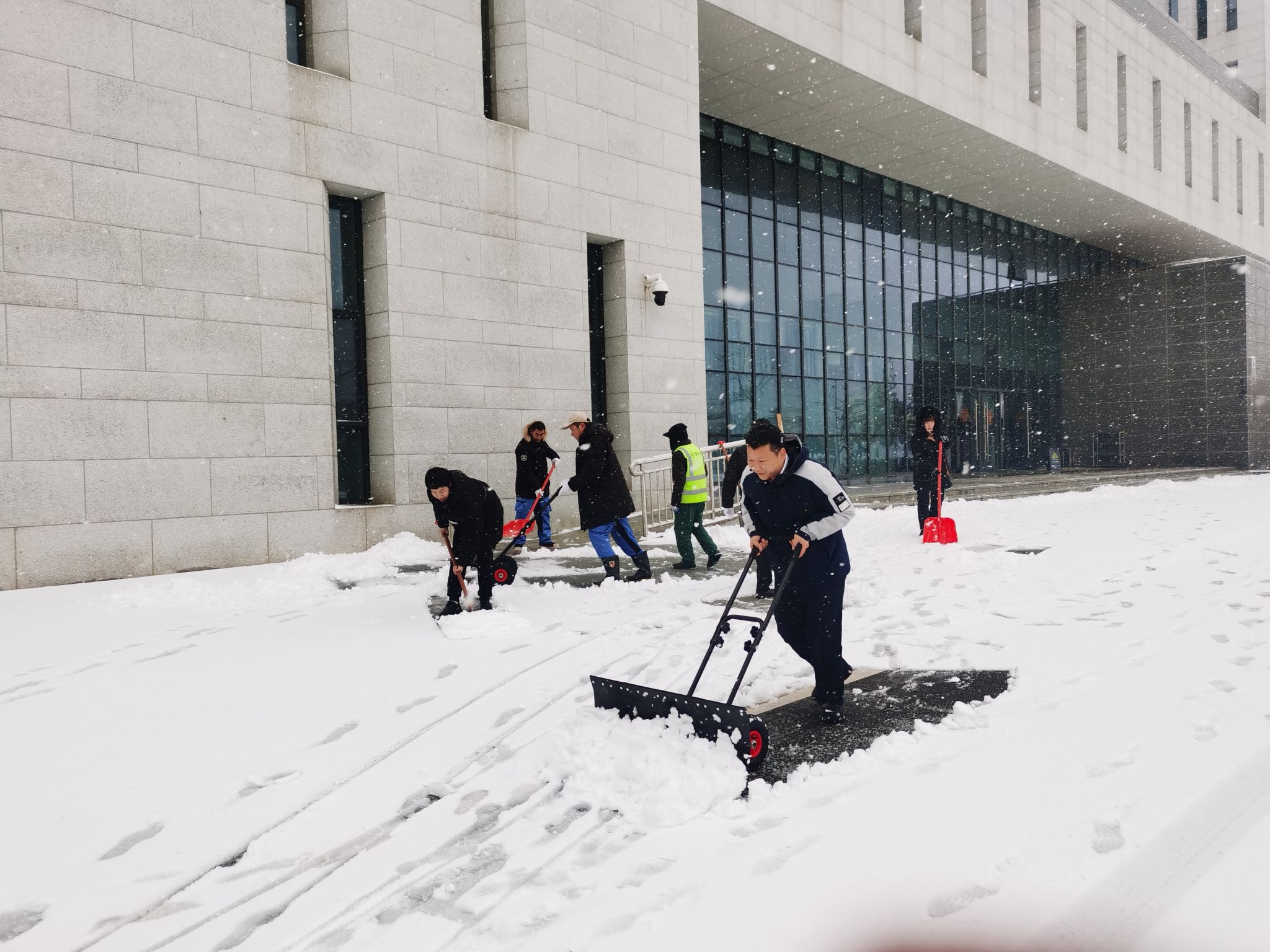 后勤保障、安全保卫工作人员,教职工党员、师生志愿者,未来城校区工作人员及未来城校区教工志愿者、安保、后勤人员,加紧清理路面积雪,为师生出行安全保驾护航。