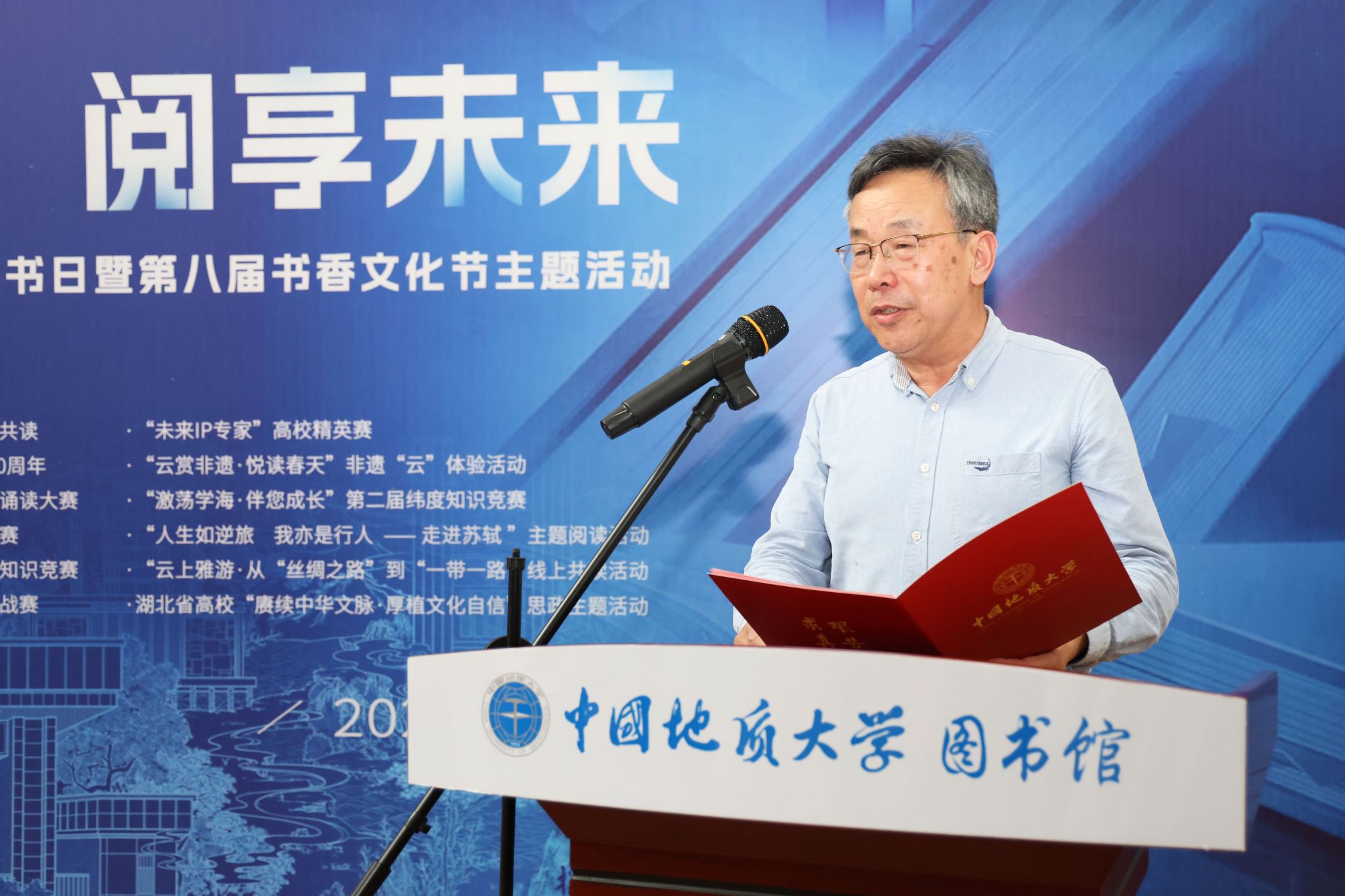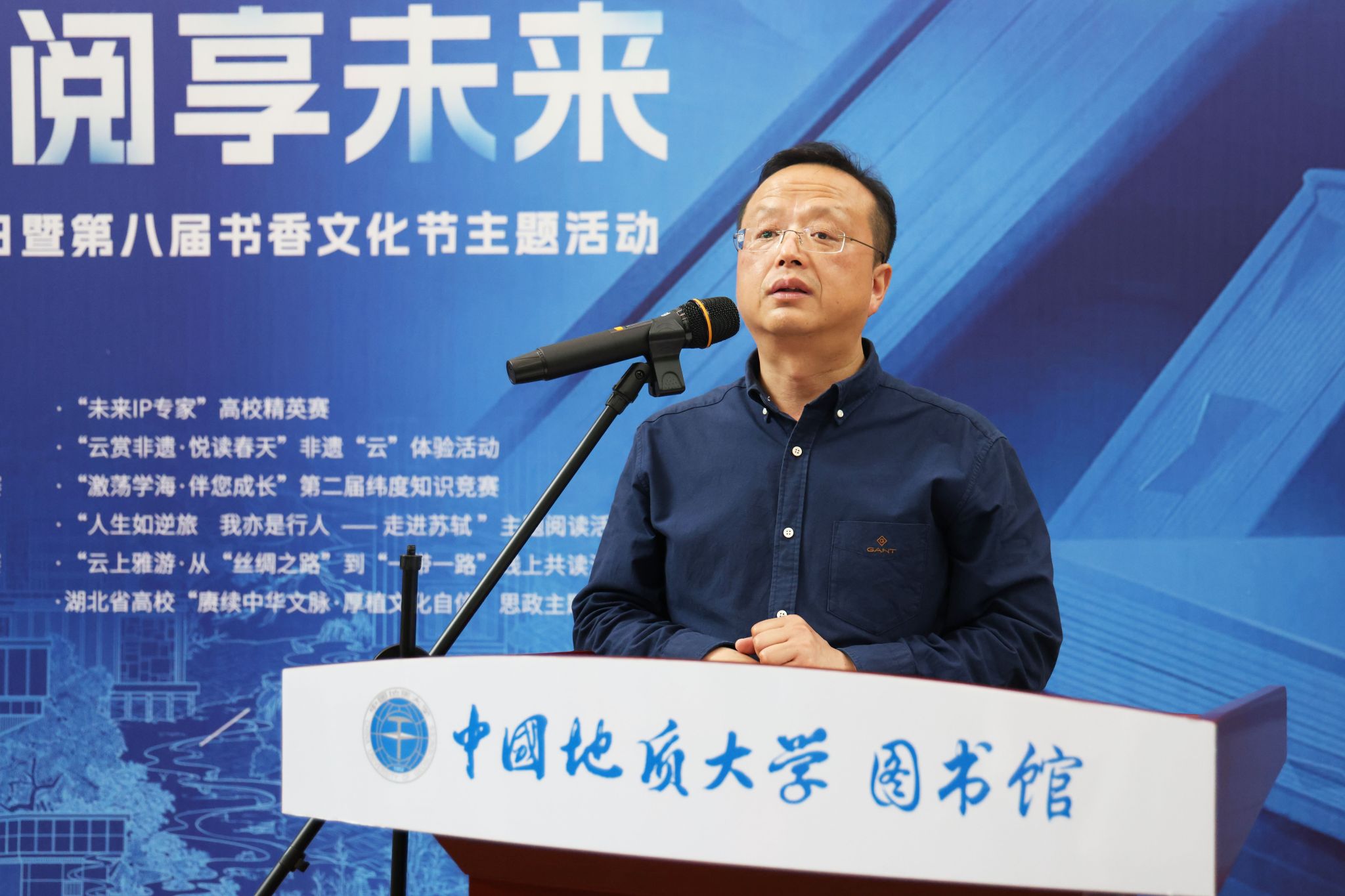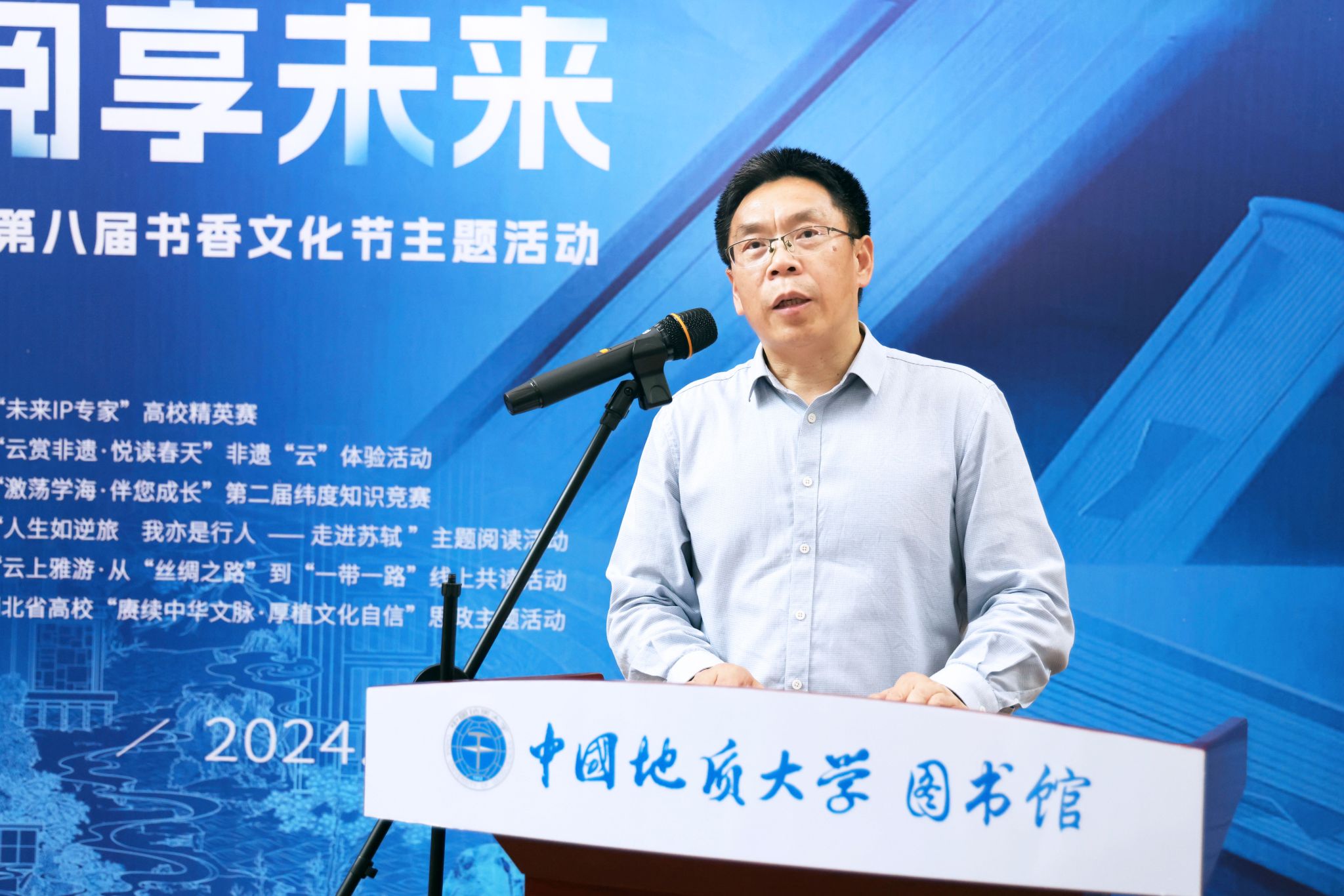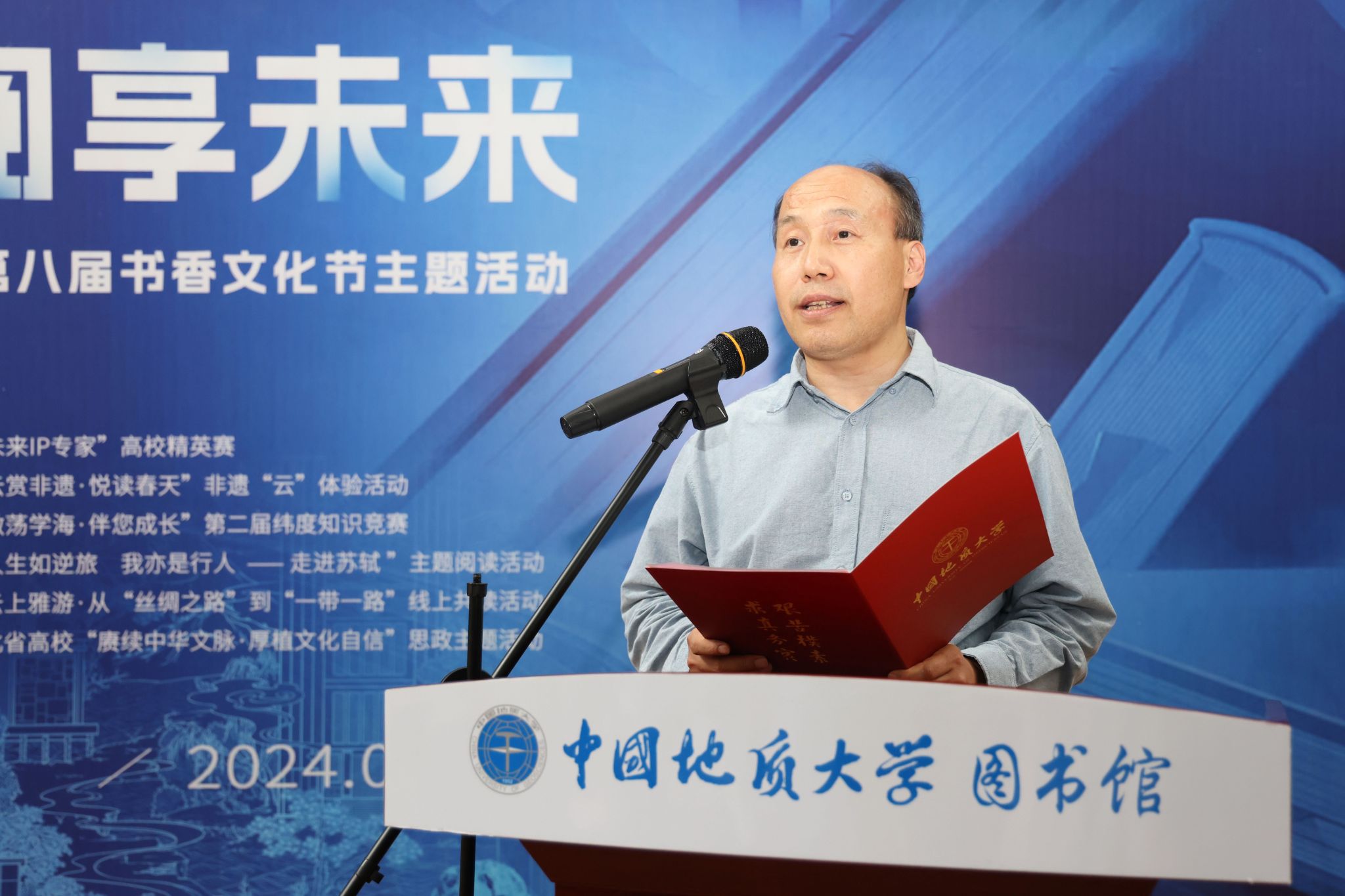 王甫致辞。他表示,开启地大第八届书香文化节是场馆育人品牌活动的进一步拓展提升。学校一直积极倡导全民阅读,全力推动书香校园建设,始终把书香地大建设作为文化建设的重要举措,把文化传承创新作为“双一流”建设的重要支撑。他希望同学们以参与书香文化节为契机,深入学习习近平总书记的读书观,以刻苦读书提升站位境界,深入领会读书学习对于党的建设、强国建设、民族复兴、青年成长的战略意义,以刻苦读书体悟“真理的味道”、增强使命担当、赓续中华文脉,把“读万卷书”和“行万里路”结合起来,努力做到学以致用、知行合一,增强投身中国式现代化建设火热实践的行动自觉,让全民阅读在地大蔚然成风,共建书香校园,共享文明校园。