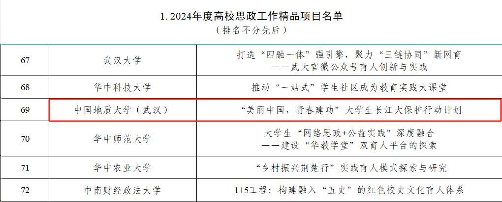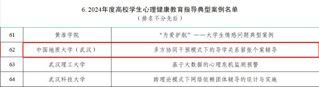 地大新闻网讯(记者 梁睿华 许小康)日前,教育部公布了2024年度思想政治工作质量提升综合改革与精品建设项目入选名单,欧博共有两个项目入选。《“美丽中国 青春建功”大学生长江大保护行动计划》入选高校思政工作精品项目,《多方协同干预模式下的导学关系紧张个案辅导》入选高校学生心理健康教育指导典型案例。