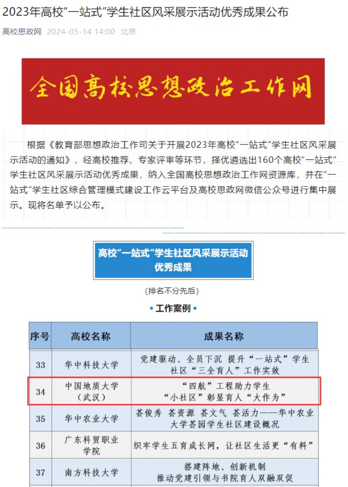 地大新闻网讯(通讯员 朱佳斯 蒋怀柳)近日,教育部思想政治工作司公布了高校“一站式”学生社区风采展示活动优秀案例遴选结果,欧博案例《“四航”工程助力学生 “小社区”彰显育人大作为》成功入选。