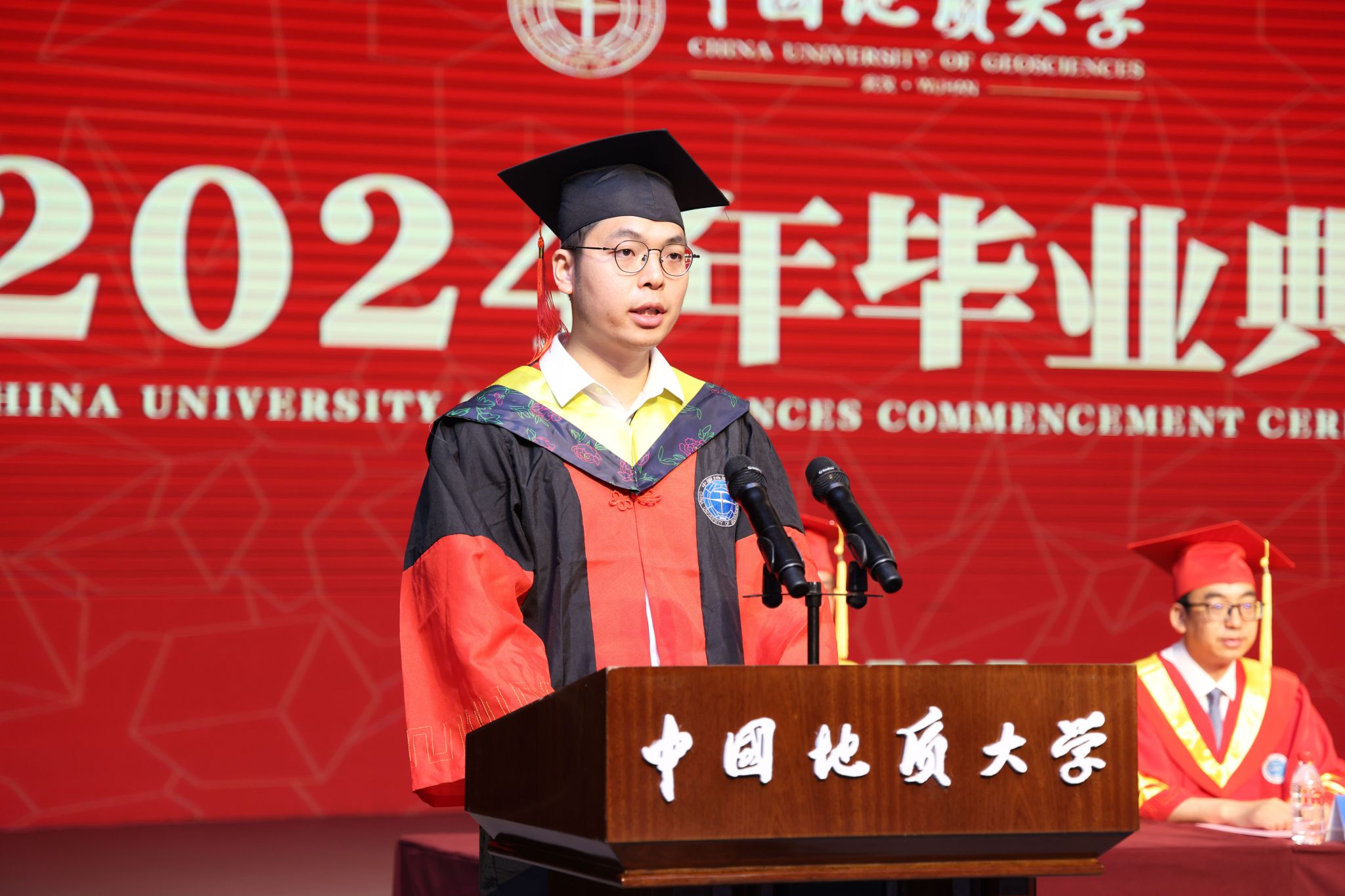 毕业本科生代表、地理与信息工程学院地理信息科学专业郭佩欣同学发言。他说,因为热爱地理,他努力考上地大求学,梦想的种子在这里生根发芽,在母校的栽培、恩师的涵育、朋辈的帮扶下,成长为一棵可以抵御风雨的大树,他将继续在热爱的地理信息科学领域追逐光、成为光、散发光,与所有毕业生一同倾听祖国的召唤、携手共赴未来,在各领域为国攀登,成为堪当民族复兴大任的栋梁之材。