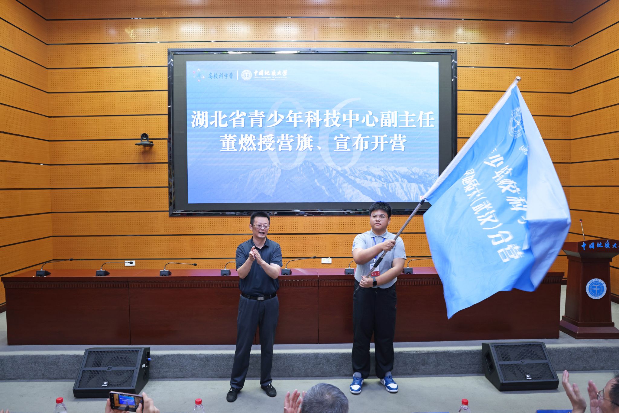 董燃向志愿者代表徐一航同学授旗,并宣布地大分营正式开营。
