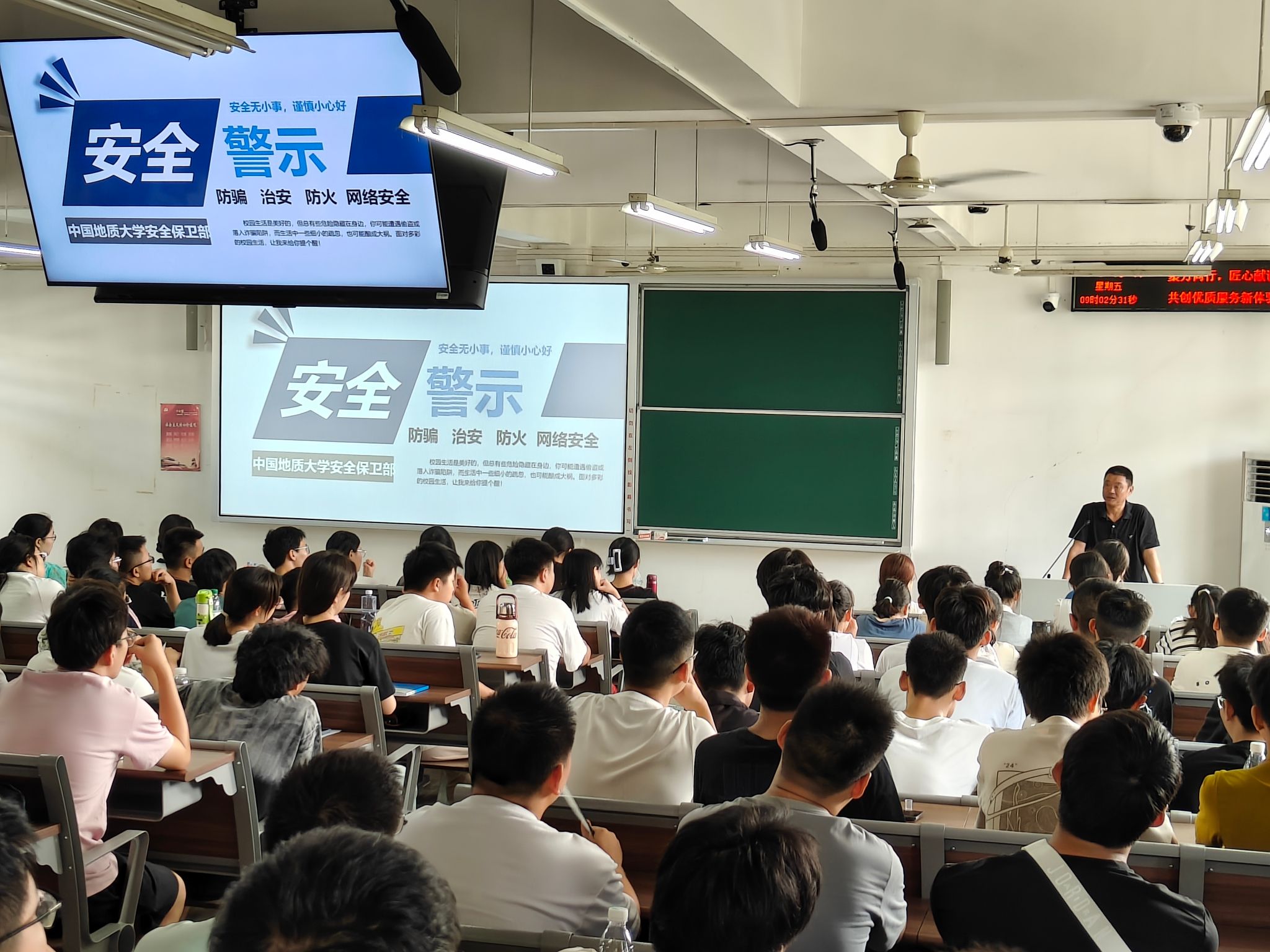 校团委书记朱丹、安全保卫部副部长彭冠军、校医院副院长魏从兵、学生就业指导处曾艺老师,分别围绕学校共青团特色品牌工作、安全防范技能、大学生健康知识、生涯规划问题四个方面授课,引导新生筑牢理想信念根基、绷紧安全之弦、守护身心健康、培养职业发展观念,成为一群有着远大理想、坚定信仰、敢于拼搏的地大青年。